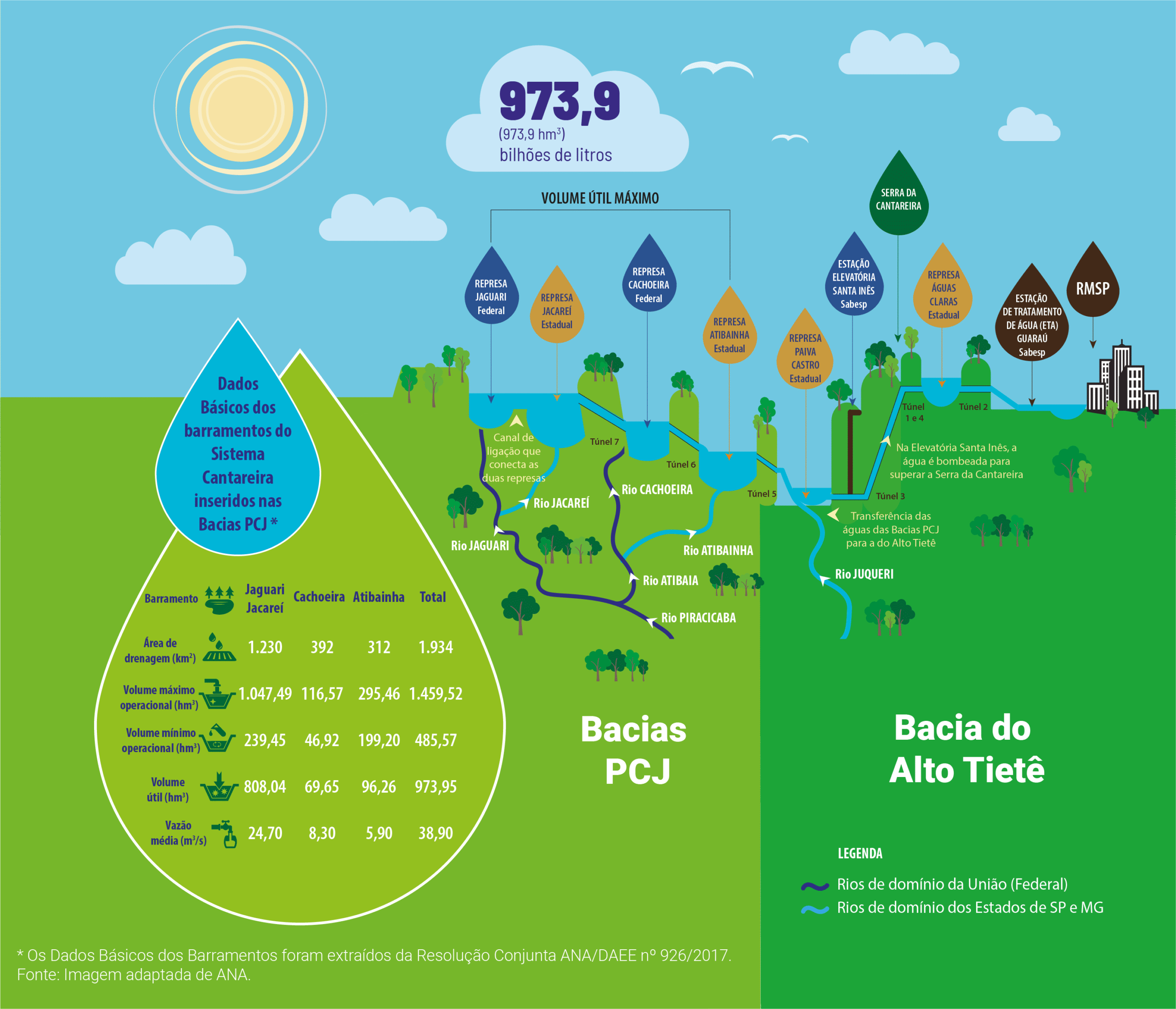 Atendendo cerca de 9 milhões de habitantes localizados nas Bacias PCJ e na Região Metropolitana de São Paulo (RMSP). O Sistema Cantareira é formado por 6 reservatórios conectados entre si por meio de túneis subterrâneos e canais. Os quatro maiores reservatórios (Jaguari, Jacareí, Cachoeira e Atibainha, localizados nas Bacias PCJ) estão localizados nas Bacias PCJ, cujas águas são direcionadas para a Bacia do Alto Tietê, abastecendo os reservatórios de Paiva Castro e Águas Claras seguindo para Estação de Tratamento de Água Guaraú (ETA Guaraú).