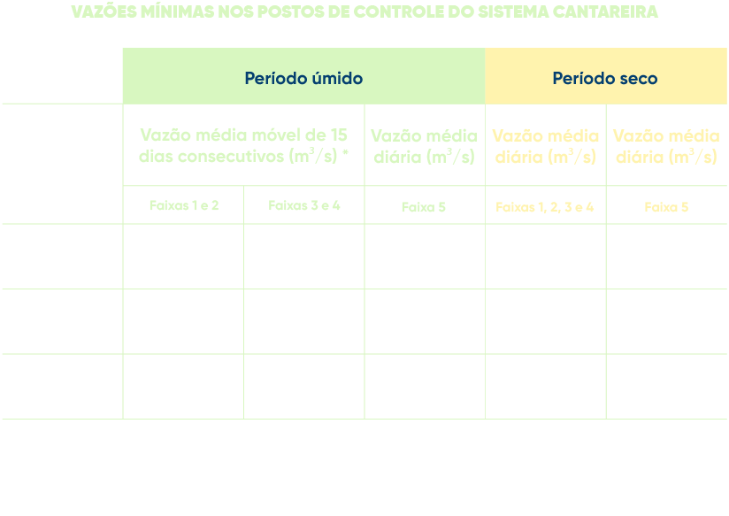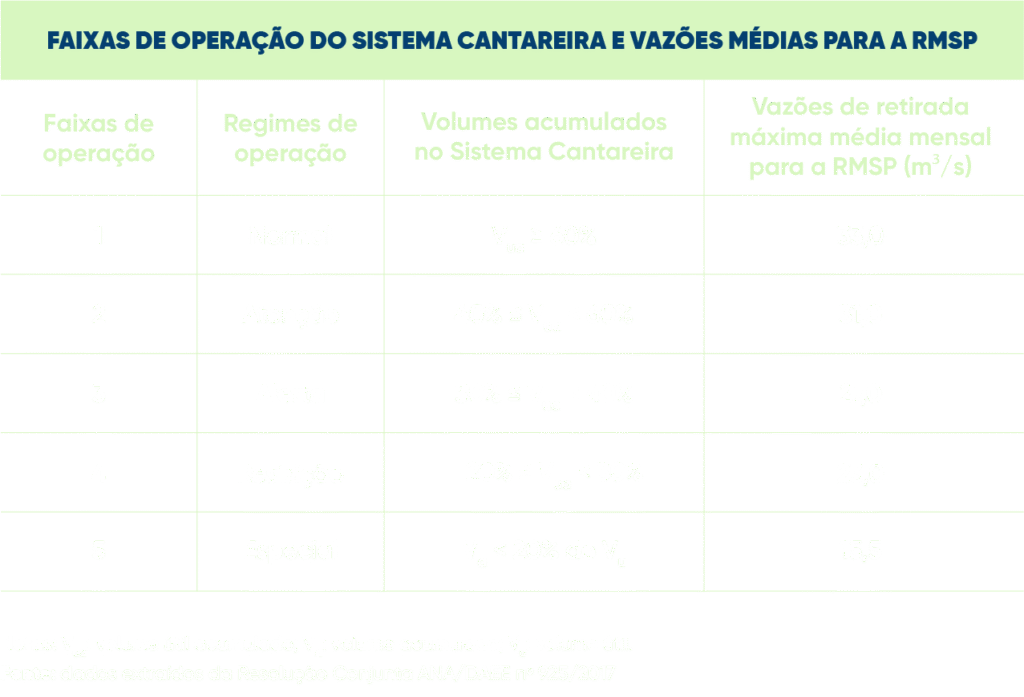 Para a RMSP, o controle da captação de água do Sistema Cantareira, realizada pela SABESP, é a vazão média captada na Estação Elevatória Santa Inês, autorizada mensalmente de acordo com as faixas de volume acumulado no referido sistema. Essas faixas de operação são estabelecidas conforme o quadro ao lado.