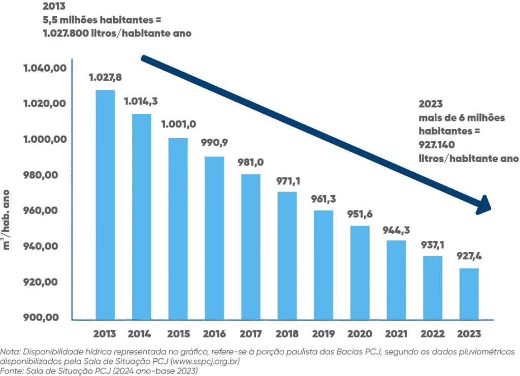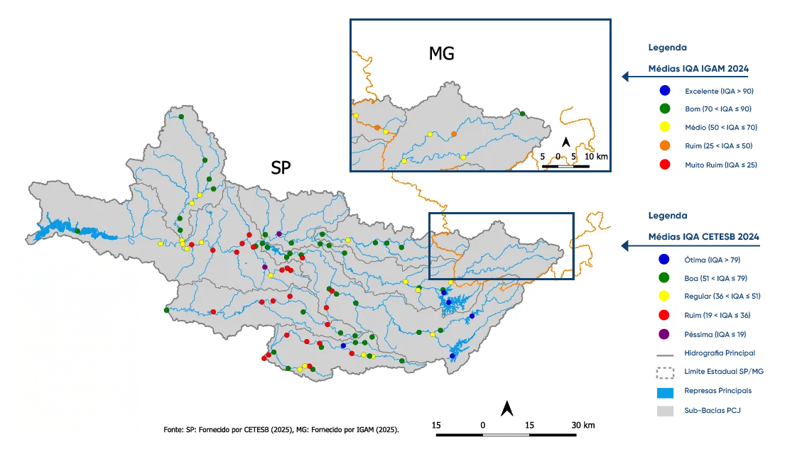 O IQA nas Bacias PCJ revela um cenário preocupante, segundo a CETESB, embora haja variações ao longo do território. Em regiões de cabeceira, os resultados geralmente indicam qualidade boa ou média, no entanto, à medida que os rios atravessam áreas urbanas, há uma piora no IQA, devido aos impactos das atividades humanas e do lançamento de esgoto. Além dos desafios associados às áreas urbanizadas, a intensificação dos eventos de estiagem tem agravado ainda mais a qualidade da água. Esses períodos de seca têm ocorrido com frequência e severidade crescentes, impactando diretamente a disponibilidade hídrica e comprometendo os parâmetros monitorados.