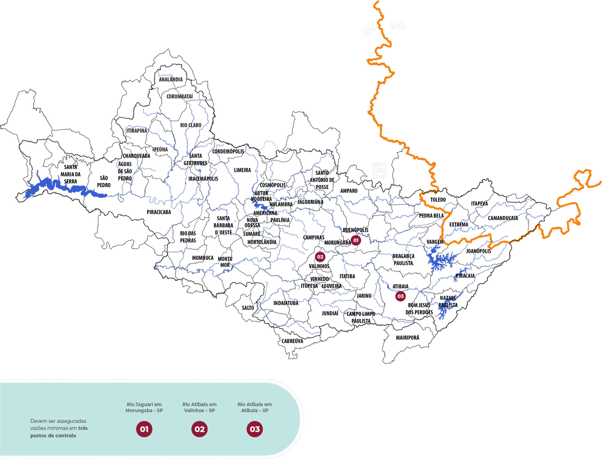 Isso também condiciona a liberação de vazões para as Bacias PCJ, em que devem ser asseguradas vazões mínimas em três postos de controle: Rio Jaguari em Buenópolis (Morungaba/SP), Rio Atibaia em Atibaia (Atibaia/SP) e Rio Atibaia Captação Valinhos (Valinhos/SP).